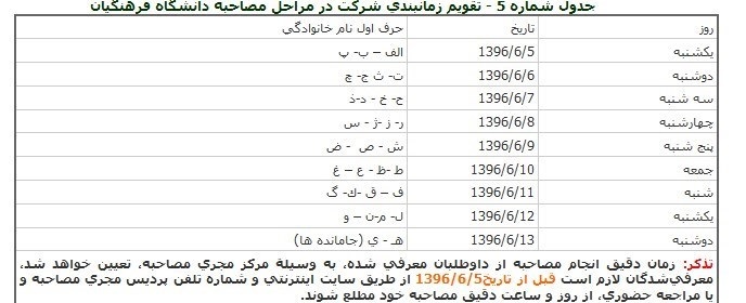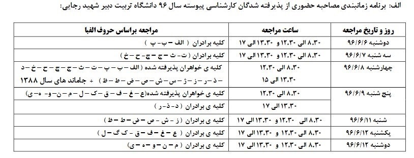 مراحل مصاحبه از روز دوشنبه 6 شهریور تا روز دوشنبه مورخ 13 شهریور 96 در دانشکده علوم انسانی دانشگاه تربیت دبیر شهید رجایی، انجام میشود. لذا از پذیرفته شدگان تقاضا میشود با به همراه داشتن تمام مدارک لازم، مطابق جدول زمانبندی زیر در زمانهای مشخص شده، شخصاً به دانشگاه مراجعه کنند.
