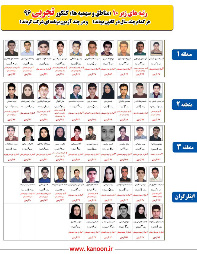 کارنامه های رتبه های زیر 100 کشوری کانون در کنکور تجربی 96 را در ادامه مشاهده کنید...