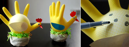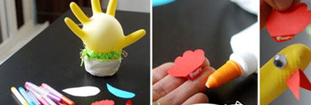 2.نیمه خالی دستکش را مطابق عکس برگردانید و داخل آنرا از کاغذ یا روزنامه مچاله شده پر کنید، در انتها روی روزنامه ها، پوشال رنگی بگذارید.