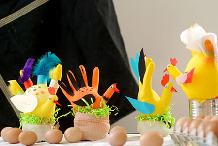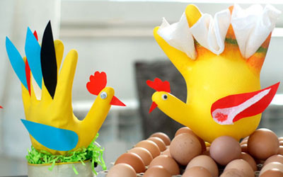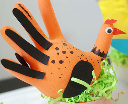 4.از مقوا رنگی برای نشان دادن بال و پر، نوک و تاج مرغ کمک بگیرید.