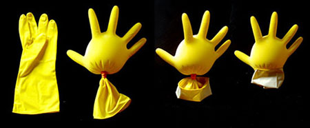 1.داخل دستکش، فوت کنید تا نیمی از آن پر از هوا بشود، سپس با بند نازک پلاستیکی دور تا دور آن را محکم ببنید تا هوا از دستکش خارج نشود.