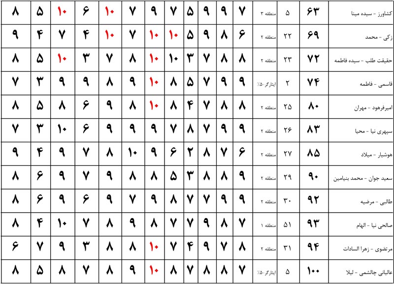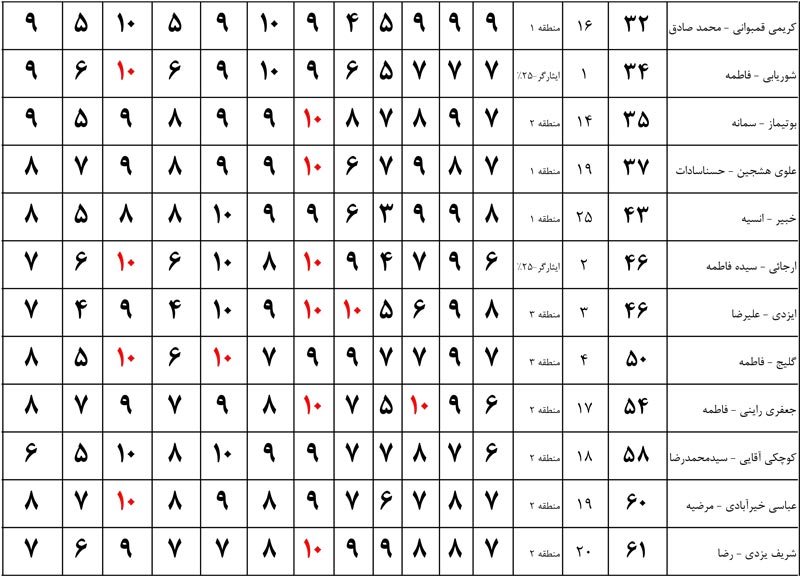 عدد های 10 که با رنگ قرمز مشخص شده اند نشان دهنده پاسخگویی 100 درصد کامل دانش آموز در کنکور است.