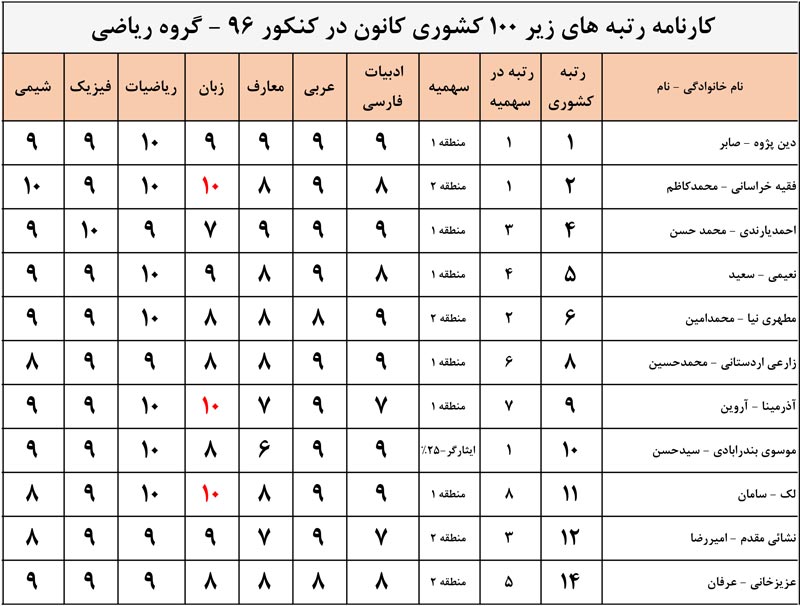 کارنامه های رتبه های زیر 100 کشوری کانون در کنکور ریاضی 96 را در ادامه مشاهده کنید...