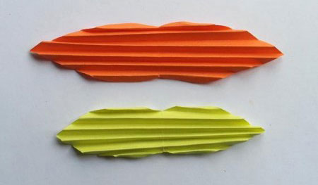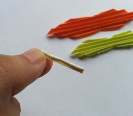 3. مانند شکل ، کاغذ را باید خیلی مرتب و در فواصل یکسانی از هم تا بزنید ، تکه کاغذ رنگی دیگری آورده و همین کار را بر روی آن نیز انجام دهید. این کاغذ باید از اولی کوچکتر باشد.