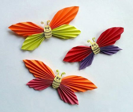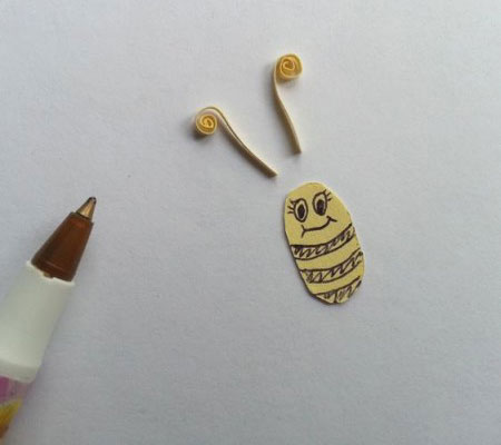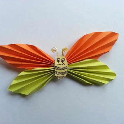 7. دو کاغذ باریک تر را که برای شاخکها انتخاب کرده بودید را کمی تا کنید و یک صورت کارتونی بامزه هم برای صورت پروانه بکشید.
