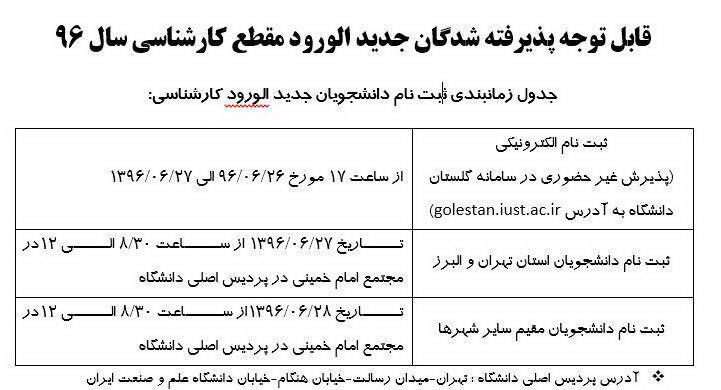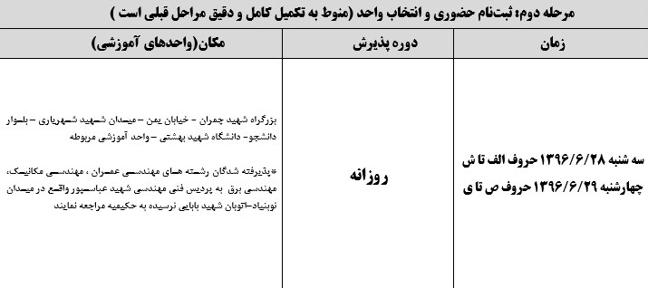 به اطلاع میرساند نظر به دو مرحلهای بودن ثبتنام، پذیرفتهشدگان میبایست به طور دقیق و کامل کل متن اطلاعيه ذيل را مطالعه نموده و پس از تکميل مدارک و فرمهاي لازم، مطابق با جدول زمانبندي جهت تحويل مدارک و پذيرش نهايي به محل اعلام شده مراجعه نمايند.