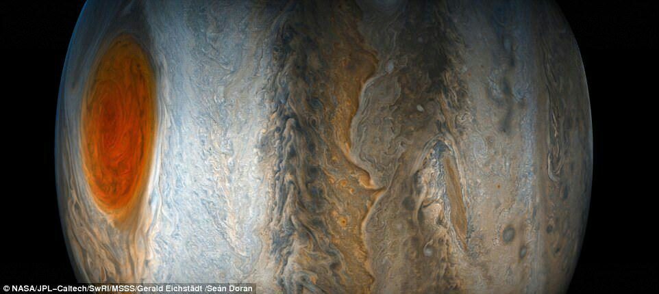 از جمله دیگر نکات قابل توجه در تصاویر جدید ارسالی از جونو، لکه قرمز توفانی در سیاره است که وسعتی برابر با ۴۰ هزار کیلومتر دارد و البته اندازه گیریهای جدید نشان داده که در سالهای اخیر اندازه آن کوچک شده است.