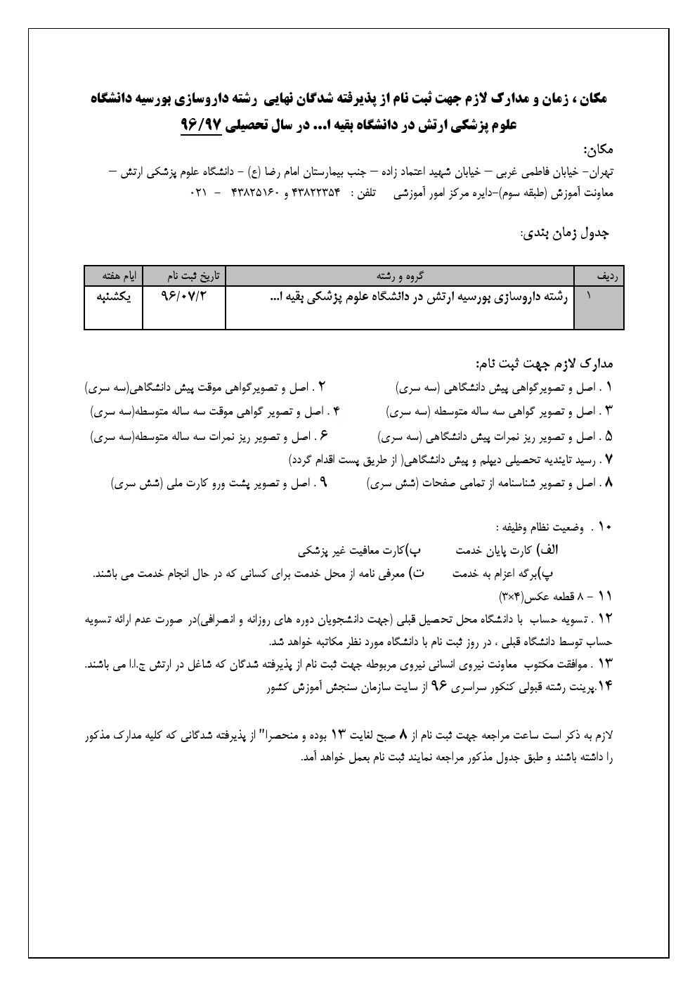 * به اطلاع می رساند پذیرفته شدگان عزیز لازم است طبق جدول زمانبندی زیر جهت ثبت نام حضوری به مکان اعلام شده مراجعه نمایند.