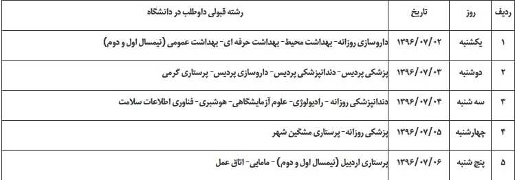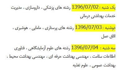 رشته های: فناوری اطلاعات سلامت-پرتوشناسی (رادیولوژی)-تغذیه-علوم صنایع غذایی-بهداشت محیط-بهداشت عمومی (نیمسال اول و دوم) –بهداشت حرفه ای روز چهارشنبه مورخ 96/06/29