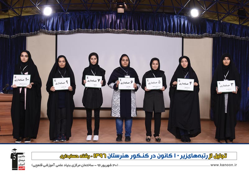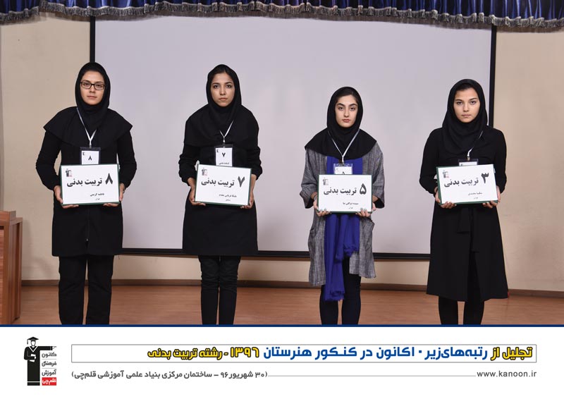 ردیف بالا، از راست: سپیده توکلی نیا (تربیت بدنی: رتبه 2 استان تهران) - مهسا بگوند (حسابداری: رتبه 2 استان تهران) - سارا اسماعیلی (حسابداری: رتبه 1 استان گیلان) - زهرا عزیززاده (حسابداری: رتبه ا کل شهرستان های تهران) - نگار ظفر (حسابداری: رتبه ا کل شهرستان های تهران) - آوا فاضلی (معماری: رتبه 6 کشور) - فرشته شیرپور (گرافیک: رتبه 3 کشور)، نگار سلیمان پور (معماری: رتبه 1 کشور)