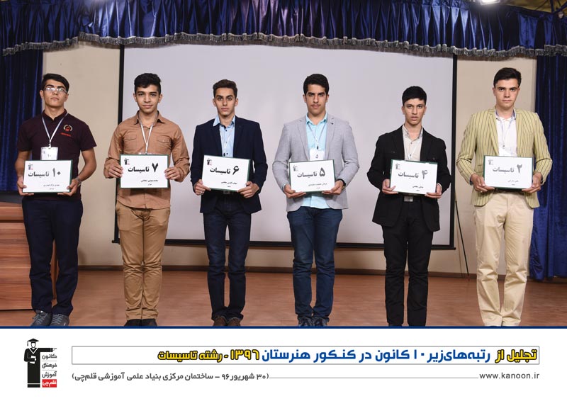 ردیف پایین، از راست: میثم فرقانی (نقشه برداری : رتبه 3 کشور) - علیرضا یاسین (نقشه برداری: رتبه 4 کشور) - شایان معلمی (تاسیسات: رتبه 1 کشور) - محمدرضا قانعی مطلق (الکتروتکنیک : رتبه 3 کشور) - شهاب الدین معلمی (تاسیسات: رتبه ا کشور) - امین اسدی (معماری: رتبه 3 کشور) - معین برزگر (نقشه برداری : رتبه 2 کشور)، مهدی نورالهی (کامپیوتر: رتبه 7 کشور) - علی شارعی (تاسیسات: رتبه 5 کشور)