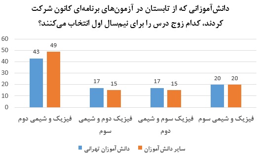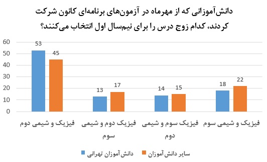 انتخابهای تلفیقی در هر دو گروه هم تقریباً گرایشی برابر را در میان دانشآموزان داشتهاند. به عبارتی 17 درصد دانشآموزان تهرانی فیزیک دوم را در کنار شیمی سوم انتخاب کردهاند و 17 درصد هم فیزیک سوم را در کنار شیمی دوم مورد توجه قرار دادهاند. همینطور این انتخاب تلفیقی برای سایر دانشآموزان در کشور به طور برابر 15 درصد برای هر دو گرایش بوده است.