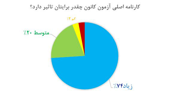 بر اساس نظرخواهی نتایج آزمون 5 آبان 94 درصد از دانش آموزان اهمیت کارنامه اصلی را در کنار سایر کارنامه ها درک نموده اند. 74 درصد از دانش آموزان تاثیر این کارنامه را زیاد می دانند و 20 درصد تاثیر آن را متوسط می دانند.