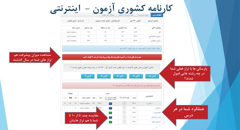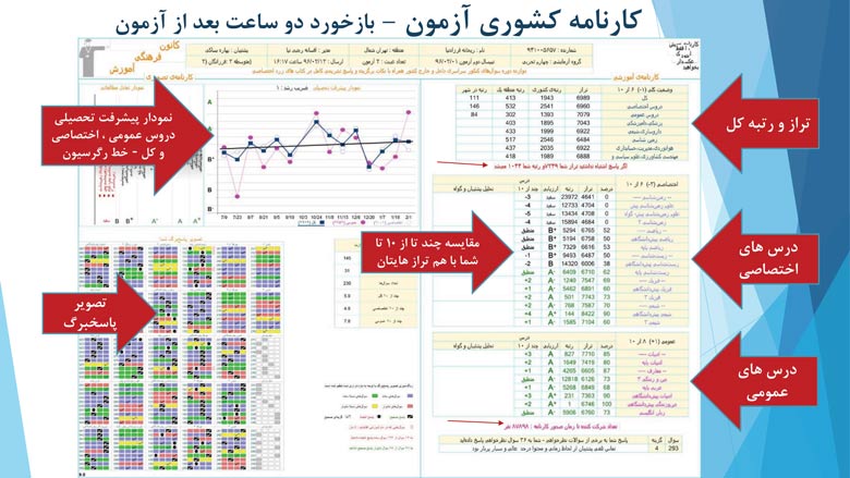 کارنامه ی اصلی آزمون را در همان روز جمعه ای که آزمون داده اید دریافت می کنید . این کارنامه را همه می شناسند و دانش آموزان و اولیا به آن توجه می کنند . این کارنامه علاوه بر رتبه و تراز کل ،شامل اجزای متنوعی است که خوب است شما هر کدام را بشناسید و برای ارزیابی خودتان از آن ها بهره بگیرید.