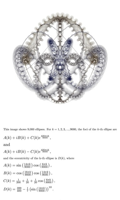 این نابغه ریاضی در توضیح تصویر یادشده اظهار کرد:این تصویر متشکل از 9 هزار بیضی است که برای هر کدام از آنها 2 کانون و یک خروج از مرکز به کمک توابع مثلثاتی تعریف کرده ام.