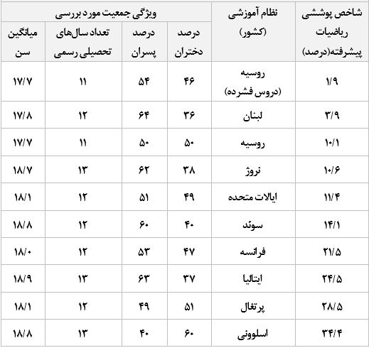 جدول 1. شاخص پوششي و ويژگيهاي جمعيت دانشآموزان مورد بررسي در تيمز براي درس رياضيات پيشرفته نسبت به نظام آموزشي کشورها: 2015