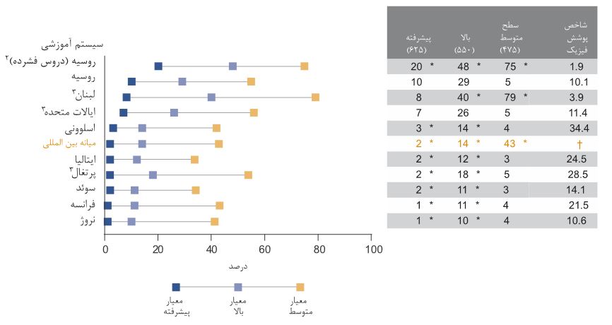 شکل 3، درصد دانشآموزان تيمز پيشرفته که به ترازهای بينالمللي تيمز در رياضيات پيشرفته دست پيدا کردهاند، نسبت به نظام آموزشي کشورشان.