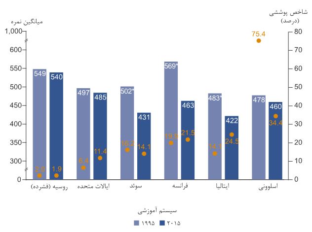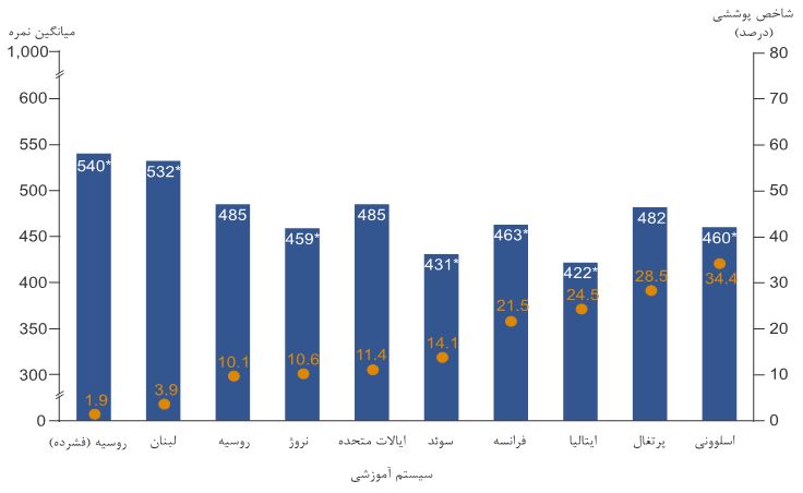 شکل 1 میانگین نمرهی ریاضیات پیشرفته و شاخص پوشش دانشآموزان شرکت کرده در تیمز پیشرفته را نشان می دهد.