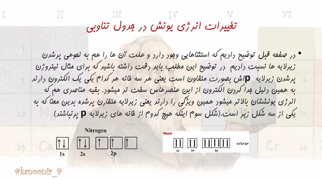 مفهوم انرژی یونش، تغییرات آن در جدول تناوبی، مفهوم جهش و یافتن عناصر با توجه به جهشها آمده است.