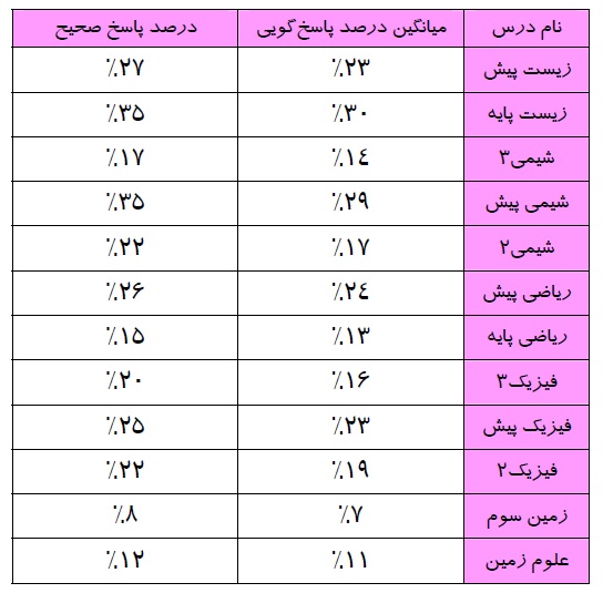 آزمون امروز در همه درسهای پیش (ریاضی عمومی، زیست پیش، فیزیک پیش و شیمی پیش) آسان بوده است.