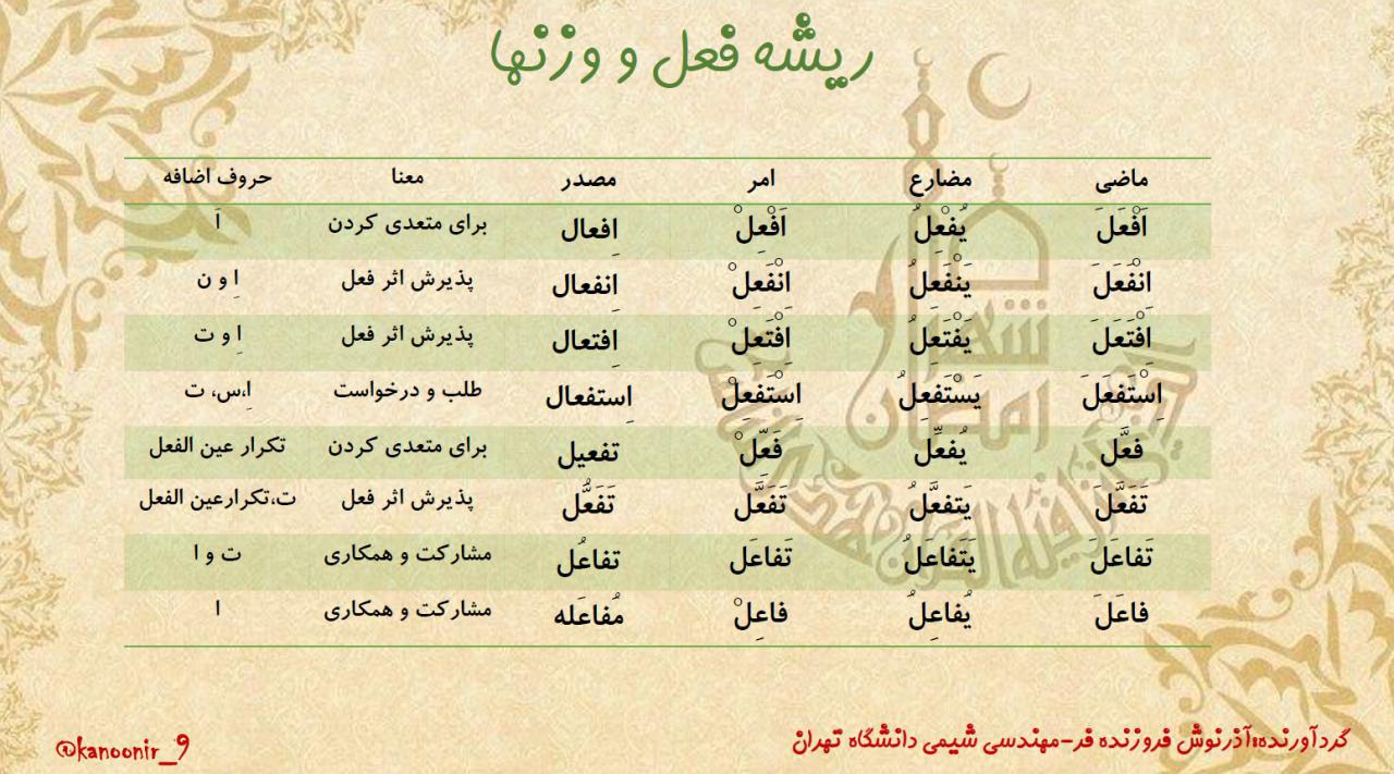 آموزش مفاهیم مربوط به ریشه افعال و وزنها پیشنهاد: فایل ضمیمه را در پوشهای تحت عنوان آموزش عربی نهم(ریشه و وزن فعل) ذخیره کنید.
