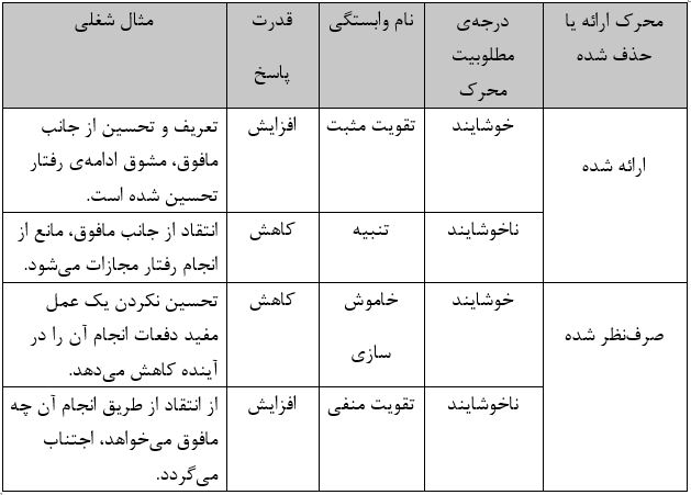 تقویت مثبت | هنگامی که کار به موقع تمام میشود، مدیر از کارمند تعریف کند. | افزایش رفتار مطلوب |