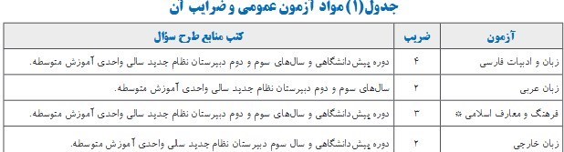 مواد آزمون عمومی کنکور سال ۹۷ برای همه گروه ها مشابه است و سوالها در سطح اطلاعات علمی کتابهای نظام جدید آموزش متوسطه سالی واحدی طرح می شود. مواد آزمون و اهمیت(ضریب) هر یک از آنها و کتابهای منبع طرح سوال بدین شرح است: