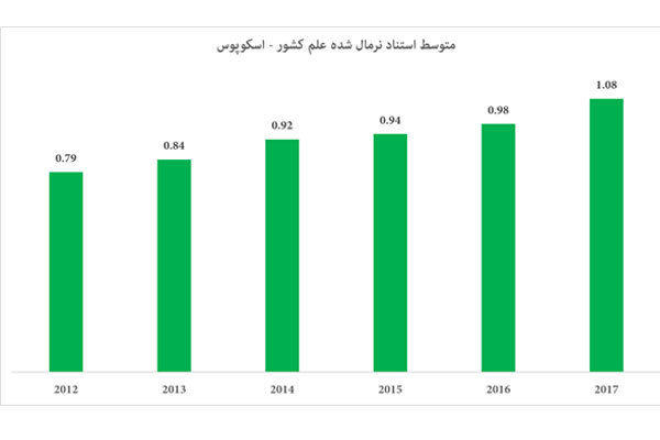 عضو هیات علمی مرکز منطقه ای اطلاع رسانی علوم و فناوری یادآور شد: متوسط استنادهای نرمال شده به ازای مقالات کشور از ۰.۷۹ در سال ۲۰۱۲ به ۱.۰۸ در سال ۲۰۱۷ رسیده است. متوسط استناد نرمال شده به ازای مقالات کشور در سال ۲۰۱۶ نیز ۰.۹۸ بوده است.