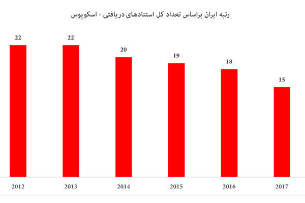وی افزود: آمار پایگاه اسکوپوس نشان می دهد که رتبه ایران براساس تعداد کل استنادهای دریافتی از ۲۲ در سال ۲۰۱۲ به رتبه ۱۹ در سال ۲۰۱۵، ۱۸ در سال ۲۰۱۶ و ۱۵ در سال ۲۰۱۷ رسیده است.