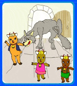 گرگه گفت :در رو واز کنین واسه شما علف آوردم.(البته تو متن نبود ولی حتما صداشو هم عوض کرده بوده).
