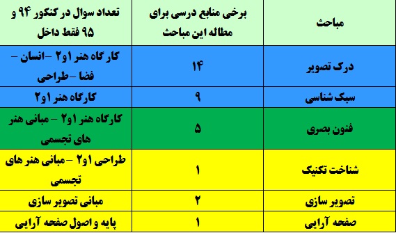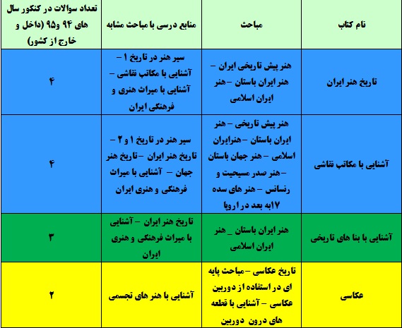 درک عمومی هنر آزمون 7 فروردین ، مباحث مهمی چون هنر ایران اسلامی و نگار گری ایران بررسی می شود. این مباحث معمولا 7 الی 10 سوال را در کنکور به خود اختصاص می دهند. در کنکور های سال 94 و95 ( داخل و خارج از کشور) مجموعا 13 سوال مستقیما از روی متن کتاب هایی که در این آزمون معرفی شده اند طرح شده است.