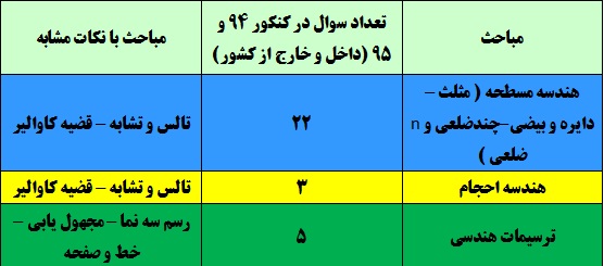 مباحث درک عمومی ریاضی و فیزیک در آزمون 7 فروردین هندسه مسطحه و فضایی ، تبدیلات هندسی و فیزیک نور می باشد . هندسه عموما 35 درصد سوالات درک عمومیریاضی را به خود اختصاص میدهد . قسمت های مختلف این بخش را در اشتراک با یکدیگر بررسی کنید . مثلا دایره های محیطی و محاطی را در هر بخش از هندسه مثلث ، چند ضلعی ها و N ضلعی ها بررسی کنید . در کنکور سال های 94 و 95 داخل و خارج از کشور مجموعا 40 سوال از این مباحث طرح شده بودند. فیزیک نور مبحثی است که هر ساله یک سوال از 5 سوال فیزیک به آن اختصاص می یابد . سوالات مربوط به این مبحث عموما پیچیدگی خاصی ندارند و بر اساس فرمول ها طرح می شوند.