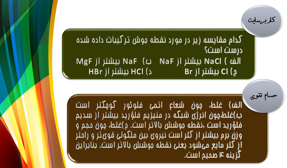 کنکوری های عزیزتعدادی از سوالات شیمی سال دوم را از بین کامنت های ارسالی شما انتخاب کرده ایم و همراه با پاسخ آنها در اختیار شما قرار می دهیم.مطالب مرتبط :چند نکته از شیمی ( سری اول ) چند نکته از شیمی ( سری دوم ) چند نکته از شیمی ( سری سوم ) چند نکته از شیمی ( سری چهارم )نسخه ی PDF را هم می توانید از ضمیمه دانلود کنید.
