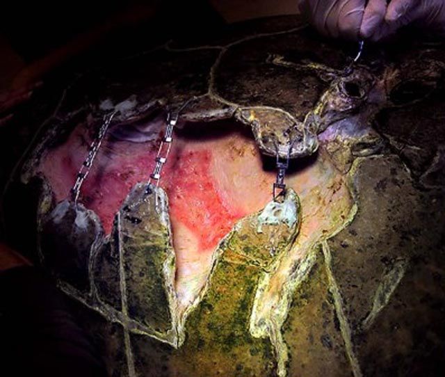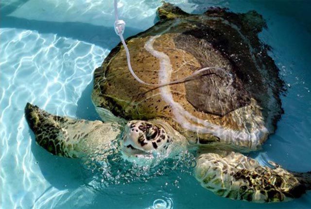 لاک پشت مصدوم پس از یکسال نگهداری و ترمیم لاک در مرکز نگهداری آبزیان کالیفرنیا در آبهای آزاد رها شد.