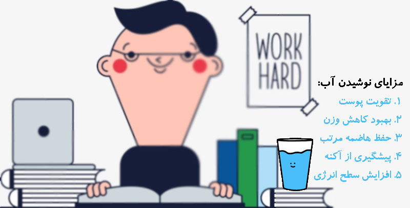 آب مهم است. حفظ سطح هیدرات یعنی مغز شما بهینه کار می کند. کم آبی باعث سردرد، کند شدن واکنش و حساسیت به نور و صدای زیاد. یک لیوان آب بزرگ را کنار خود نگاه دارید و مرتب آنرا پر کنید.