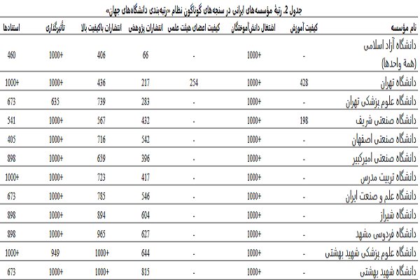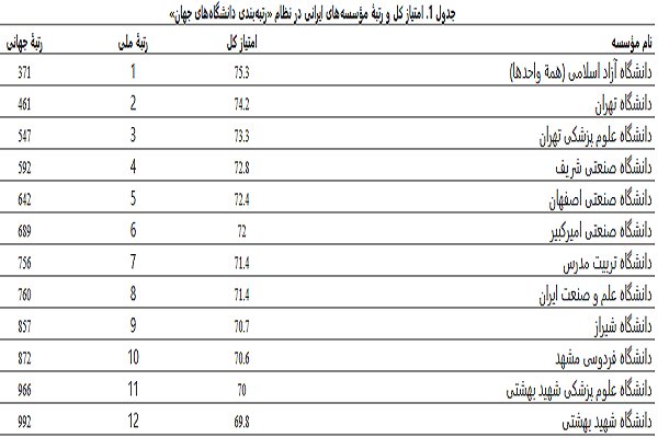 در جدول یک، امتیاز کل و رتبههای ملی و جهانی موسسههای ایرانی و در جدول دو، رتبه آنها در سنجههای گوناگون آمده است.