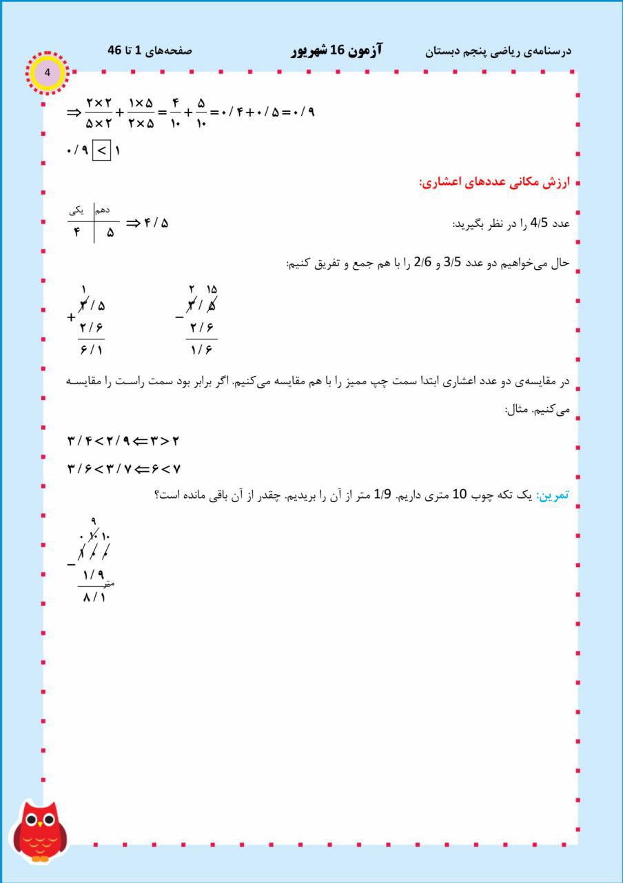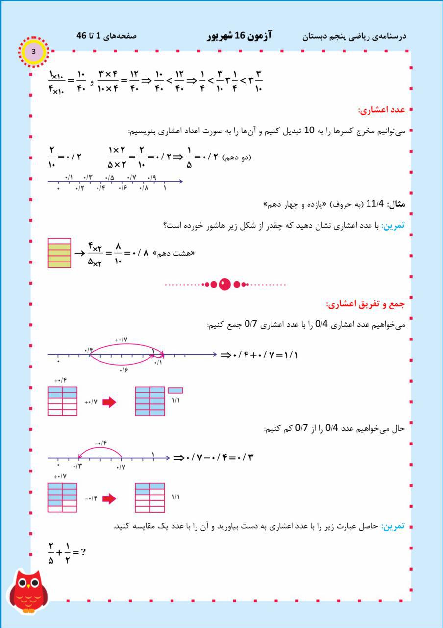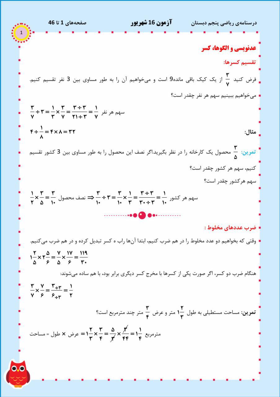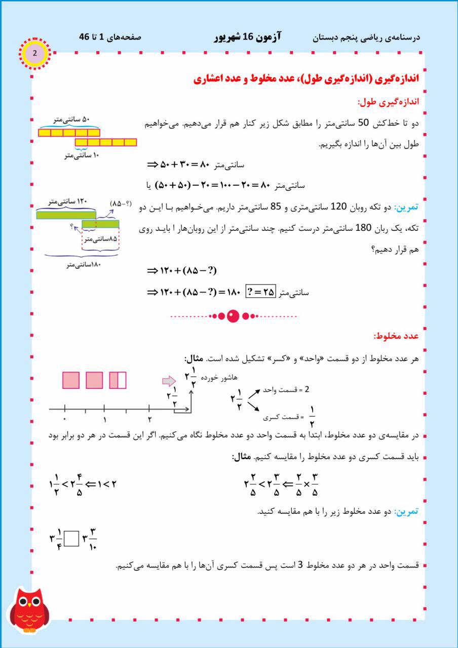 برای توضیح بیشتر فصل ها عددنویسی ، الگو ، اندازه گیری، عدد مختلط و اعداد اعشاری درسنامه زیر طرح شده است که با کمک آن می توانید اطلاعات خود را از این فصل ها کامل کنید.