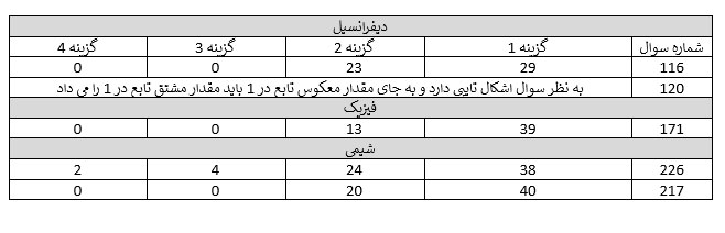 هم چون سال های گذشته در برخی سوال ها بین پاسخ این صاحب نظران تفاوت هایی وجود دارد ما در جدول زیر سوال های چالشی (بحث برانگیز) را که میزان اختلاف نظر بیش از سایر سوال هاست انتخاب کرده ایم . صاحب نظران عزیز ، دانش آموزان برتر ، دانشجویان برتر و دبیران صاحب نظر لطفا نظرات علمی خود را درباره ی پاسخ هایی که فکر می کنید صحیح هستند و علت اشتباه در گزینه های دیگر را در قسمت کامنت ها درج نمایید در قسمت کامنت ها امکان تایپ انگلیسی و نمادهای ریاضی و علمی وجود ندارد و فقط می توانید ایده ها ی خود را با زبان فارسی توضیح دهید .