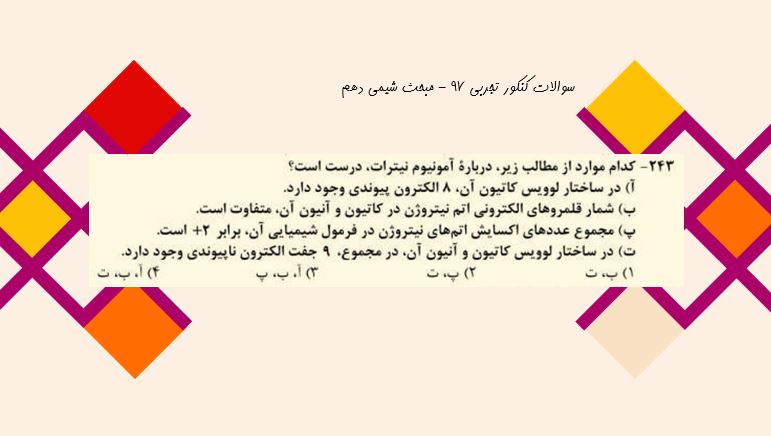 یازدهمی ها!فایل زیر سوالات کنکور ریاضی 97 از کتاب شیمی دهم است که شما همین الان قادر به پاسخ دادن به آن هستید! نمونه یکی از سوالات را در عکس زیر مشاهده می کنید! فایل سوالات را می توانید از طریق فایل موجود در ضمیمه دانلود نمایید.