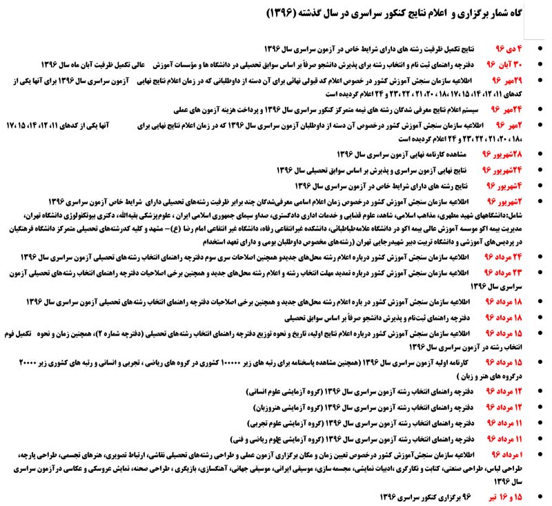 گاه شمار برگزاری و اعلام نتایج کنکور سراسری سال گذشته (1396) را در ادامه مشاهده کنید...همچنین می توانید این مطلب را در قسمت فایل های ضمیمه دانلود کنید.