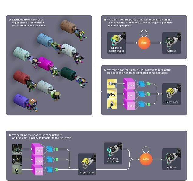 در همین راستا نخست به دست شبیه سازی شده، دستور داده شد تا روش های مختلف برای گرفتن یک بلوک اسباب بازی را بیازماید. هدف آن بود که دست رباتیک بدون انداختن بلوک، آن را بچرخاند تا صورت های مختلف آن را نمایش دهد. هر بار که دست مجازی می توانست حرف درست را روی وجه درست بلوک نمایش دهد، محققان با امتیاز به او جایزه می دادند. همین طور اگر ربات اشتباه می کرد از امتیاز او کم می شد. هنگامیکه دست مجازی توانست مکعب را بچرخاند، مانع بعدی انتقال مدل به دست رباتیک واقعی بود.