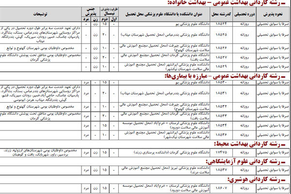 | ۴ | جیرفت | مجتمع آموزش عالی سلامت کهنوج | مخصوص داوطلبان بومی شهرستان کهنوج و توابع |