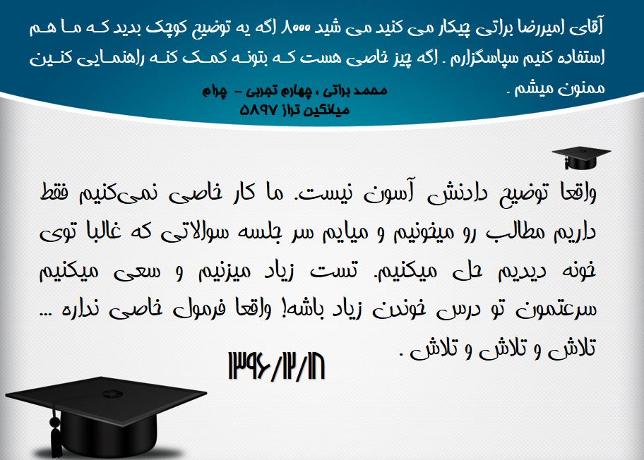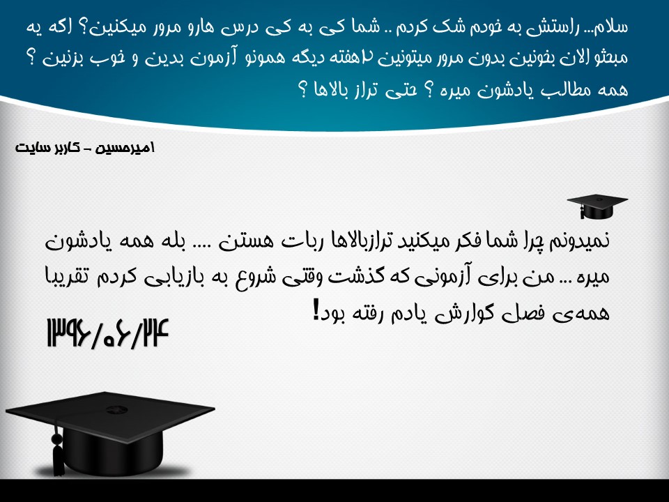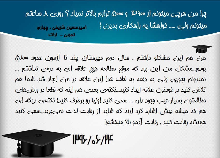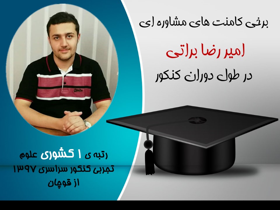 در این مطلب پاسخ های امیر رضا براتی (رتبه ی 1 کنکور تجربی 97) را که در طول یک سال اخیر به کامنت های مشاوره ای دانش آموزان در سایت کانون داده اند را برای شما آماده کرده ایم.