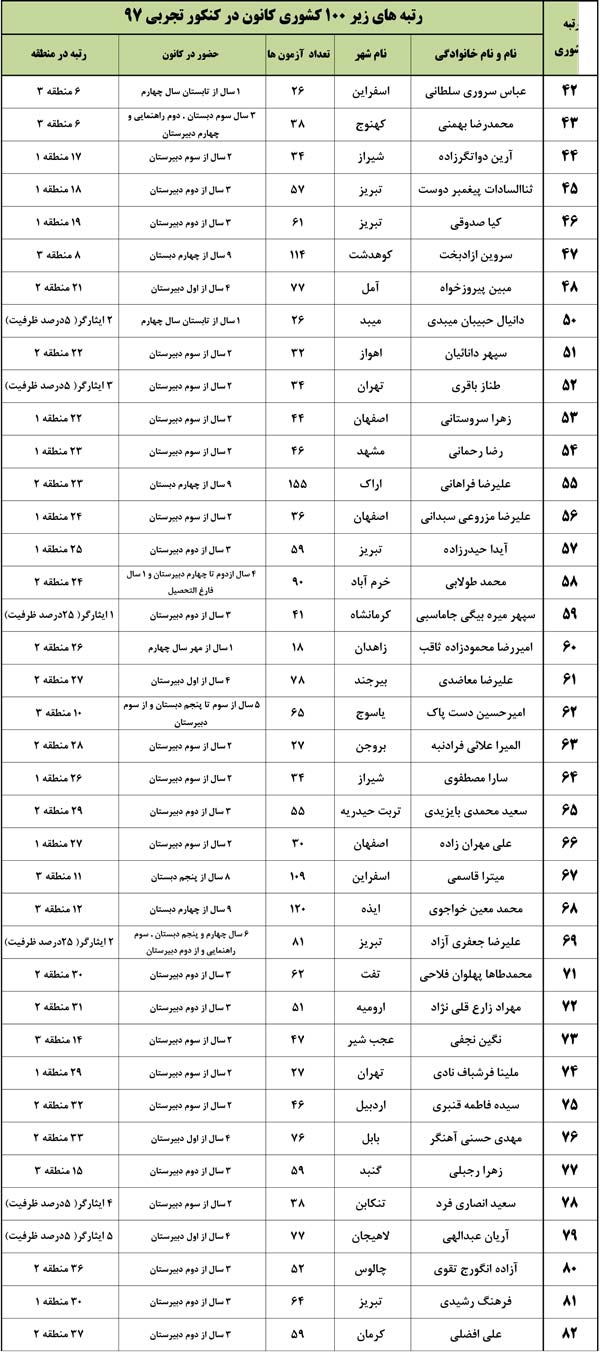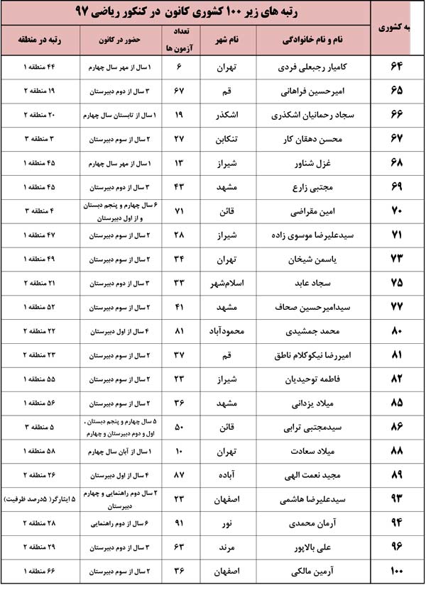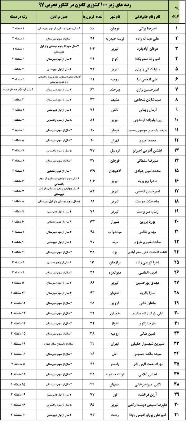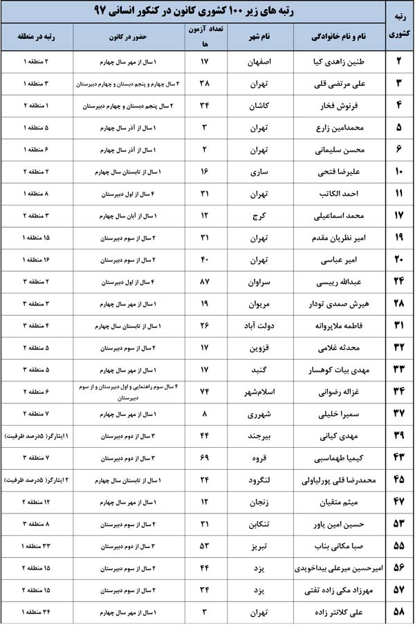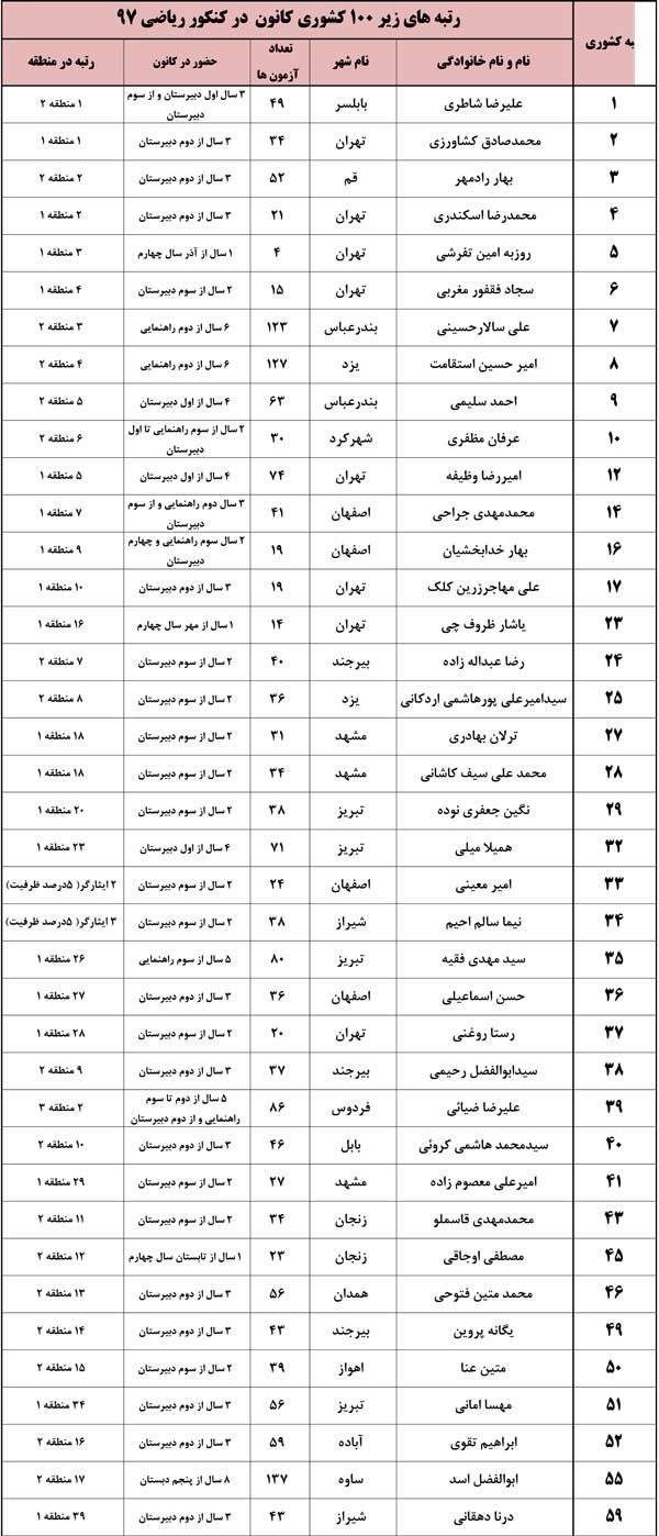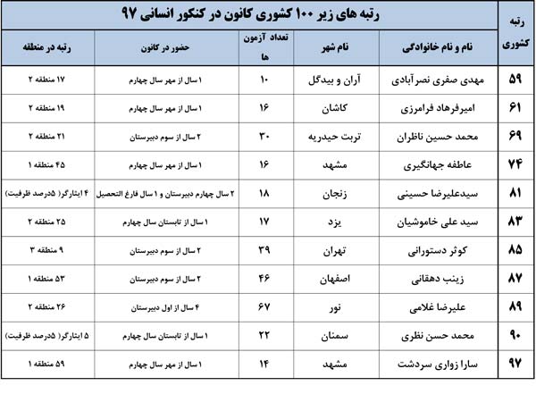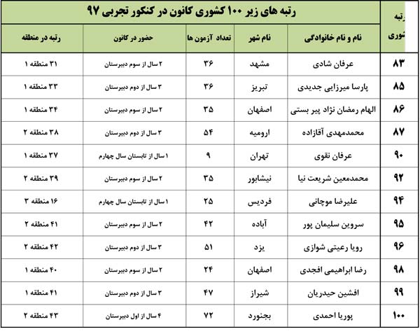 رتبه های زیر 100 کشوری کانون در کنکور 97 در هر سه رشته ریاضی - تجربی و انسانی رادر ادامه مشاهده کنید...