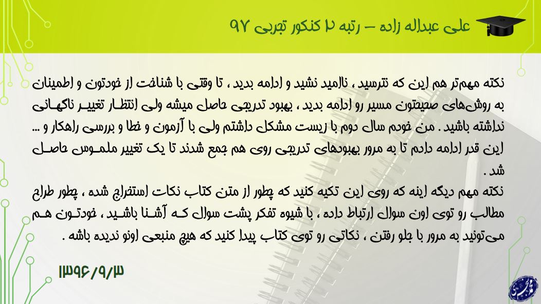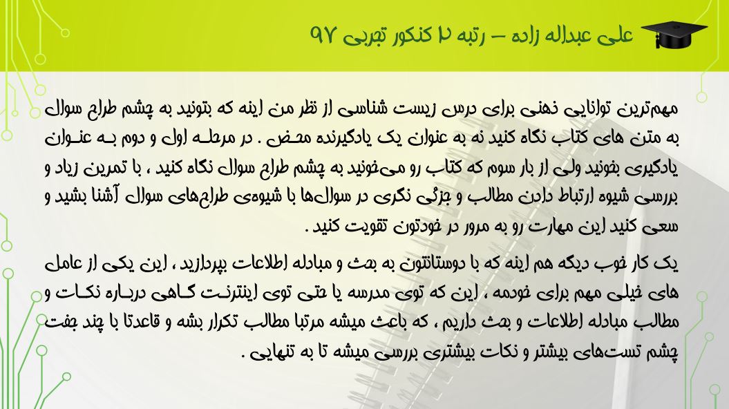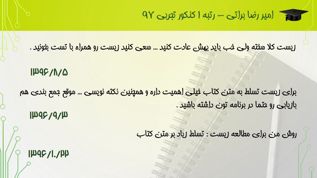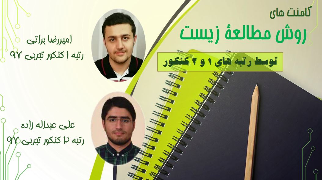 در این مطلب کامنت های رتبه های 1 و 2 کنکور تجربی 97 (امیر رضا براتی و علی عبداله زاده) راجع به روش مطالعه شان در درس زیست شناسی که در طول یک سال اخیر در سایت کانون قرار داده اند را برای شما آماده کرده ایم ، امیدواریم برای شما مفید واقع شود.