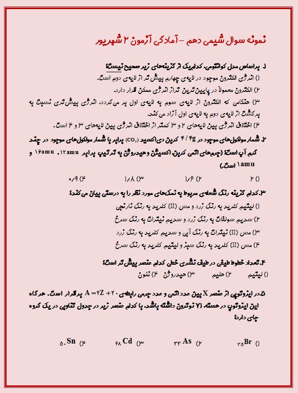 نمونه سوال شیمی دهم – آمادگی آزمون 2 شهریور