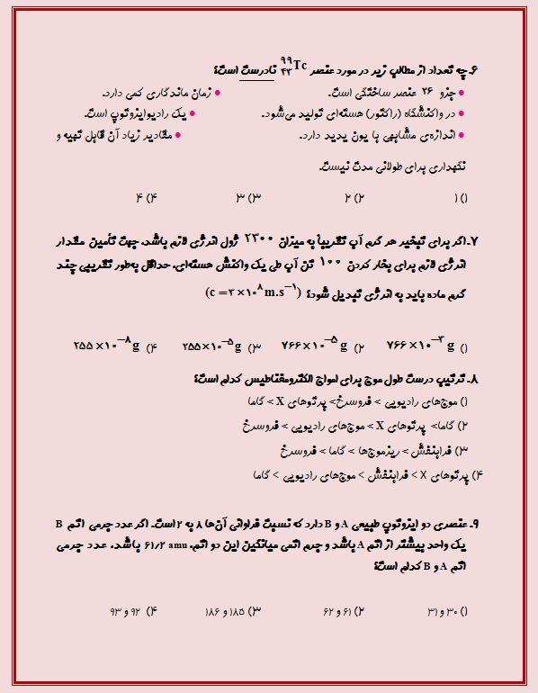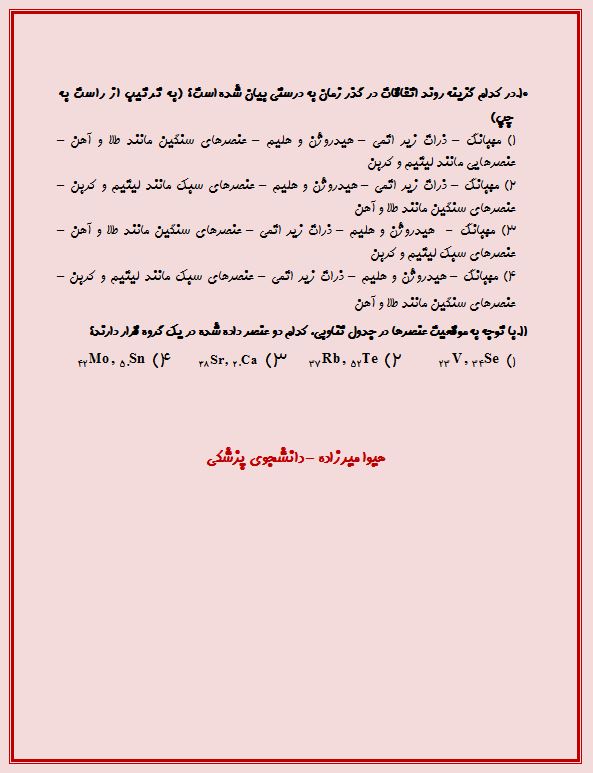 1. براساس مدل کوانتومی، کدامیک از گزینههای زیر صحیح نیست؟ 1) انرژی الکترون موجود در لایهی چهارم بیشتر از لایهی دوم است