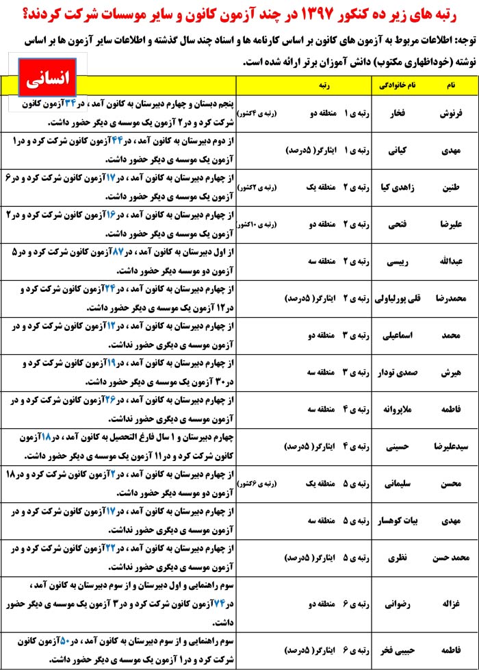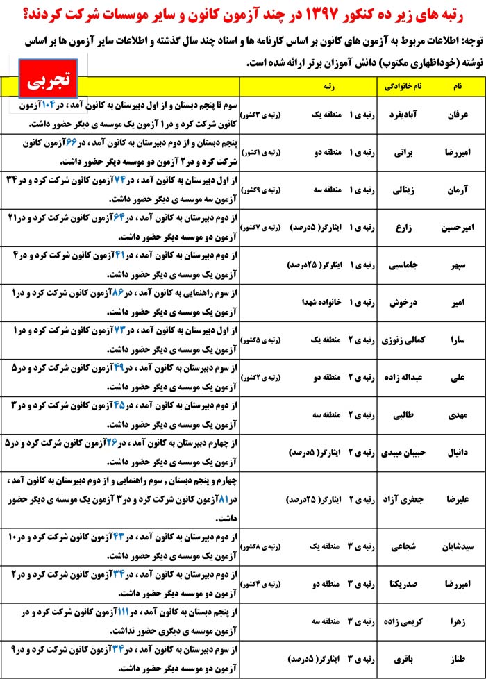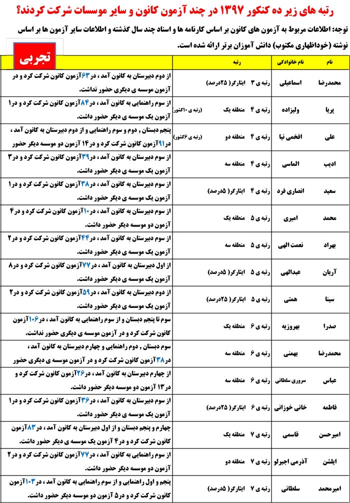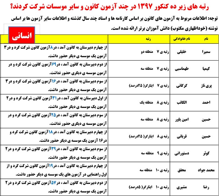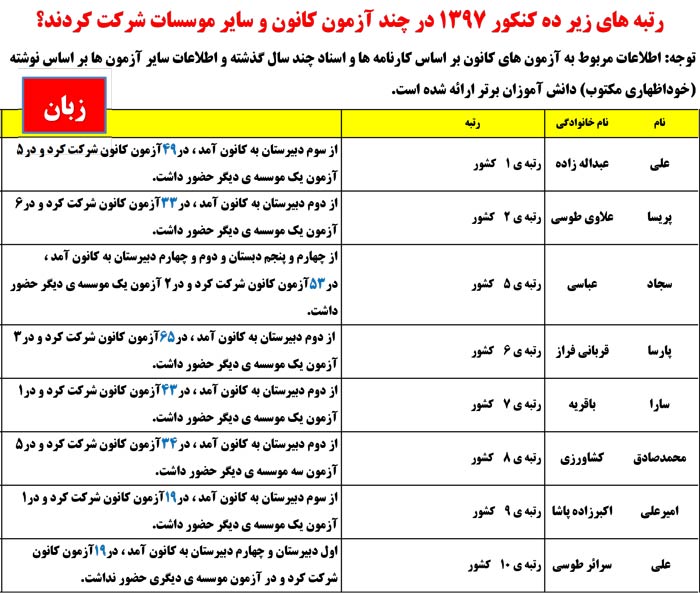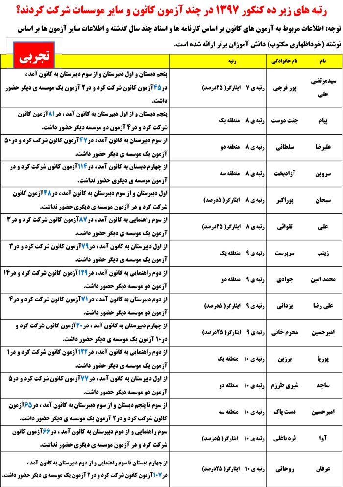 در ادامه مشاهده کنید رتبههای زیر 10کنکوردر چند آزمون کانون وموسسات دیگرشرکت کردند.