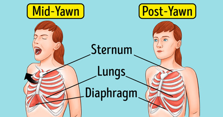 وقتی خمیازه می کشیم دهان را تاجایی که می توانیم باز می کنیم و نفس را داخل می دهیم. بنابراین هوای زیادی وارد شش ها می شود، استخوان جناغ سینه باز می شود، عضلات شکمی منعطف می شوند و دیافراگم را پایین می آورد.
