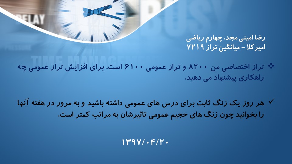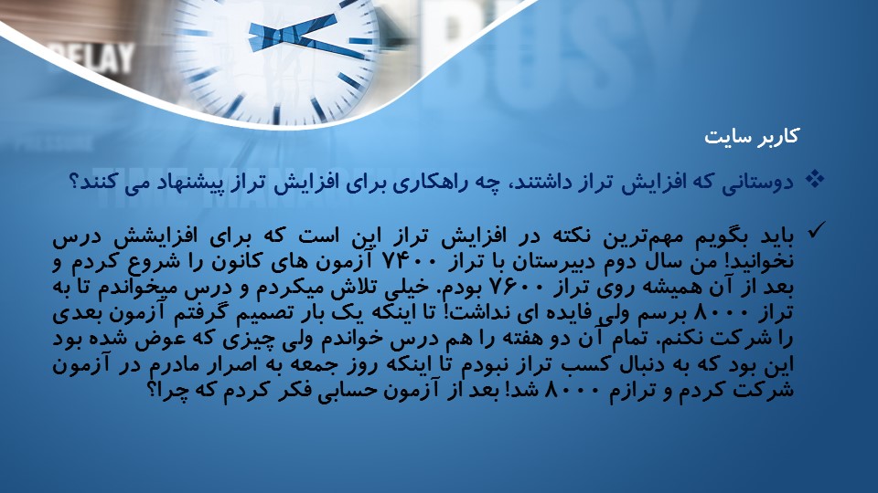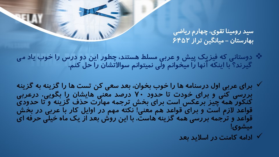 در این مطلب پاسخهای بهار رادمهر (رتبه 3 ریاضی 97) را که در طول یک سال اخیر به کامنتهای مشاوره ای دانش آموزان در سایت کانون داده اند را برای شما آماده کرده ایم...